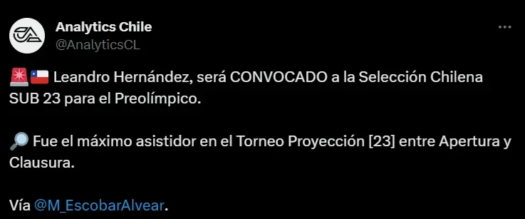 El periodista Marco Escobar fue quien informó la citación del Lea. “El delantero de Colo Colo fue nominado tras la baja de Felipe Chamorro”, escribió el comunicador de DSports en su cuenta de Twitter.