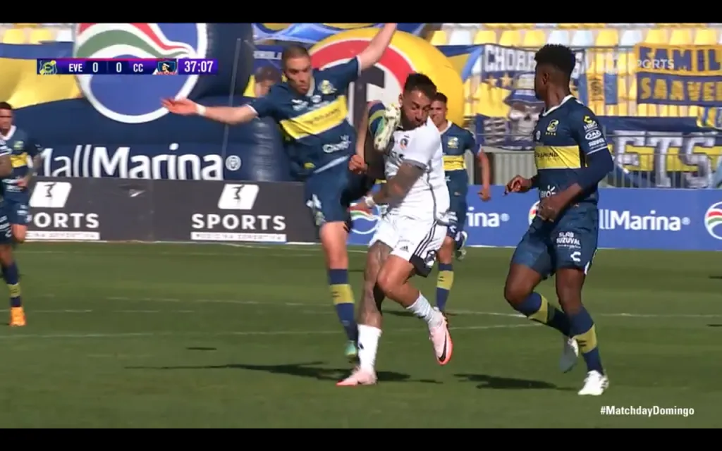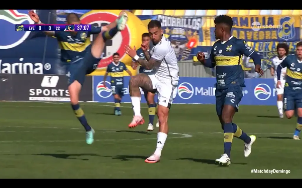 Al mirar de cerca la repetición se puede ver la razón de la decisión del árbitro. En el rechazo de una pelota disputada, Oyarzún fue con la pierna demasiado arriba y terminó impactando con la punta del pie la cara de Javier Correa.