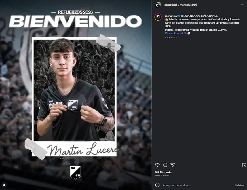 “Bienvenido al Más Grande. Martín Lucero es nuevo jugador de Central Norte y formará parte del plantel profesional que disputará la Primera Nacional 2026. Trabajo, compromiso y fútbol para el equipo Cuervo”, señalaron desde la institución trasandina para darle la bienvenida.