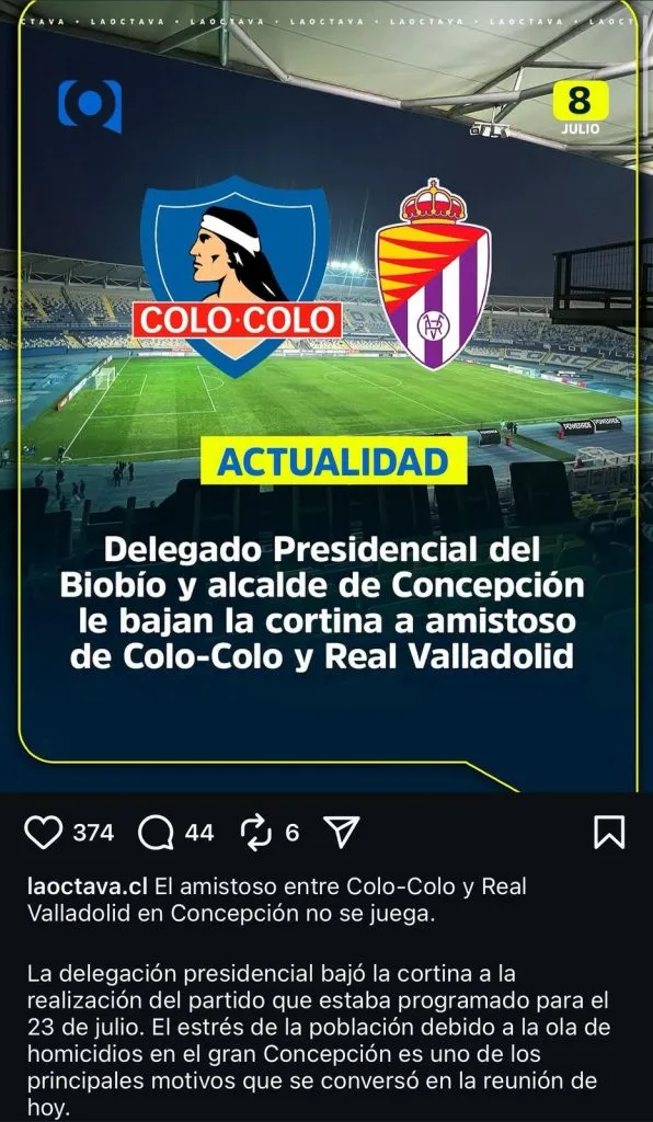 Así, al menos, lo detalló el medio La Octava, donde confirman que el encuentro amitoso entre Colo Colo y Real Valladolid no tiene la autorización por parte de la autoridad regional en Concepción.