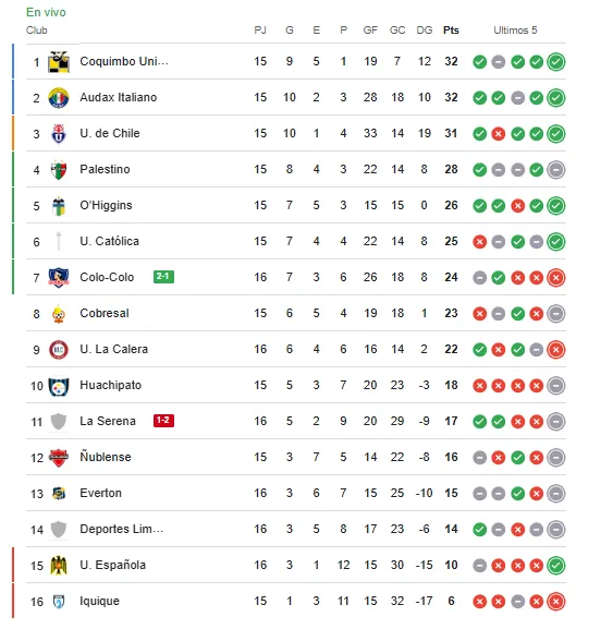 Los albos entran en zona de Copa Sudamericana con 24 puntos, ayudados por la victoria de Unión Española, mientras Deportes La Serena se estacionan con 17 positivos en el puesto 11 de la tabla de posiciones.