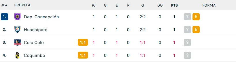 Esto quiere decir que los cuatro participantes del grupo A quedan con una unidad. Eso sí, la cantidad de goles anotados por Huachipato y Deportes Concepción les da una leve ventaja, por goles marcados.