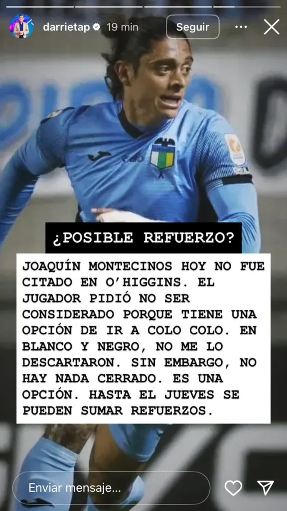 “Joaquín Montecinos hoy no fue citado en O’Higgins. El jugador pidió no ser considerado porque tiene una opción de irse a Colo Colo. En Blanco y Negro, no me lo descartaron. Sin embargo, no hay nada cerrado. Es una opción. Hasta el jueves se pueden sumar refuerzos“, indicó Arrieta en Instagram.
