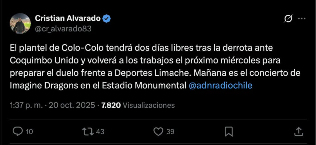 A la hora de explicar las razones de esta decisión del DT argentino, que de inmediato cayó mal en los hinchas de Colo Colo, el popular “Tomate” indicó que esto se debe a que “mañana (martes 21) es el concierto de Imagine Dragons en el Estadio Monumental“.
