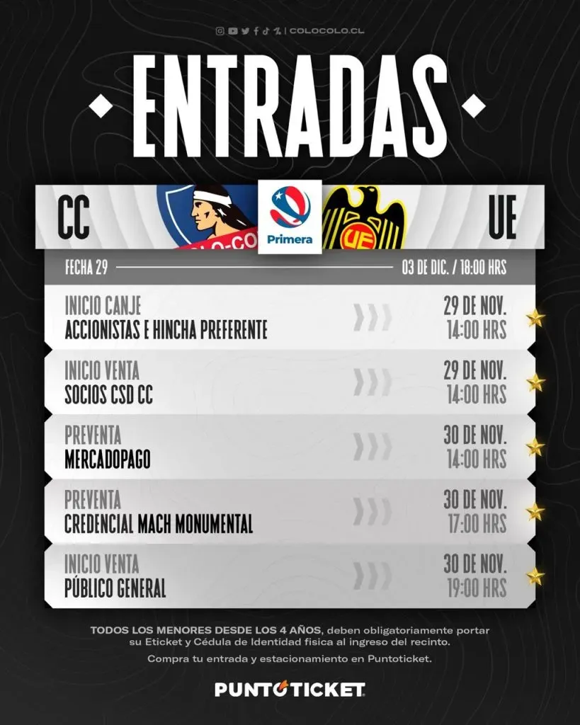 - Venta socios del Club Social y Deportivo Colo Colo: miércoles 29 de noviembre a las 14:00 horas.