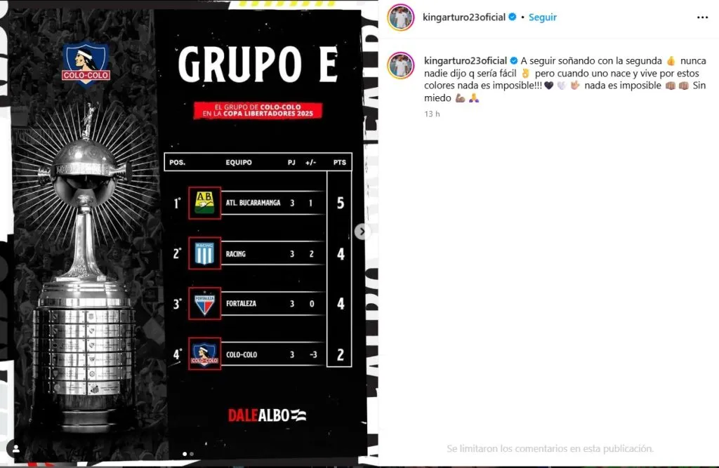 Tras esto, el histórico volante Arturo Vidal alzó la voz por lo que se le viene a los albos, que tendrán la misión de sumar puntos en sus próximos encuentros, casi por obligación, para poder seguir vivos en el campeonato internacional.