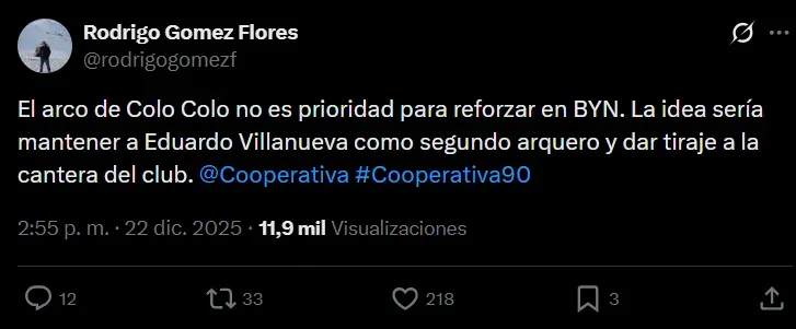 Según informó el periodista Rodrigo Gómez, de Radio Cooperativa, en su cuenta de X, Blanco y Negro, decidió frenar la búsqueda de un guardameta para el 2026; “El arco de Colo Colo no es prioridad para reforzar en BYN”, reveló el comunicador en la ex red social del pajarito, destapando la nueva hoja de ruta del club.