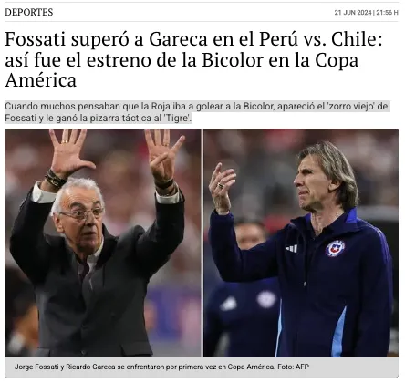 “Cuando muchos pensaban que la Roja iba a golear a la Bicolor, apareció el ‘zorro viejo’ de Fossati y le ganó la pizarra táctica al ‘Tigre'”, enfatizaron, además, haciendo del duelo entre selecciones uno entre dos estrategas.