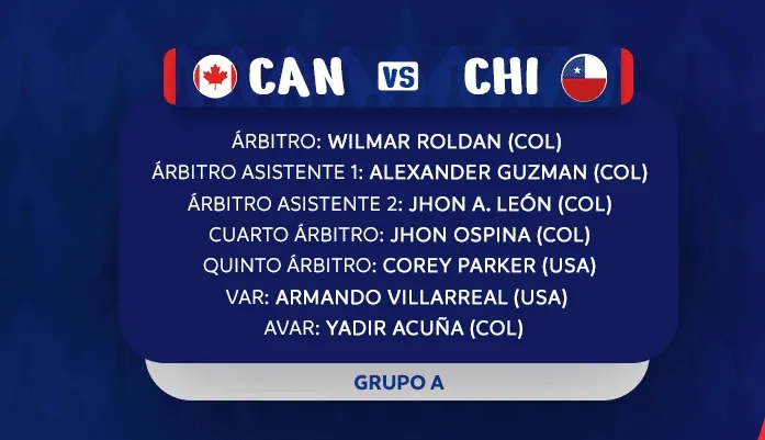 Pues bien, la Conmebol dio a conocer las designaciones arbitrales para la tercera fecha de la fase de grupos, y para el duelo de Chile ante Canadá se eligió a un viejo conocido, el colombiano Wilmar Roldán, el mismo que dirigió la Final ante Argentina en la Copa América 2015.