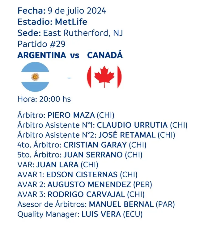 Hace instantes, el organismo dio a conocer por sus canales oficiales que Piero Maza fue el elegido por la Comisión Arbitral para dirigir el encuentro que protagonizarán las selecciones de Argentina y Canadá, en la primera semifinal a disputarse en Nueva Jersey este martes 9 de julio.