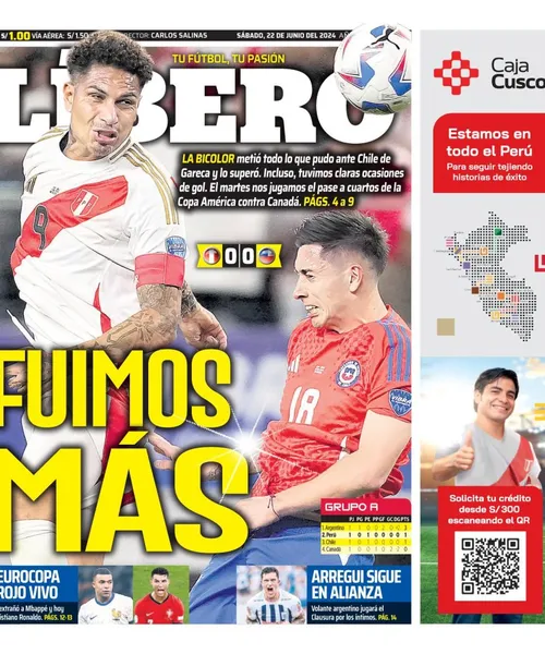 El medio Libero tituló en su portada “Fuimos Más”, agregado que “la bicolor metió todo lo que pudo ante el Chile de Gareca y lo superó. Incluso, tuvimos claras ocasiones de gol. El martes nos jugamos el paso a cuartos de la Copa América ante Canadá”.