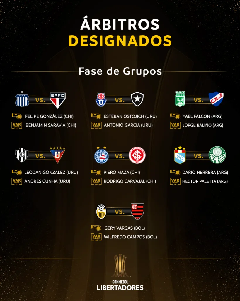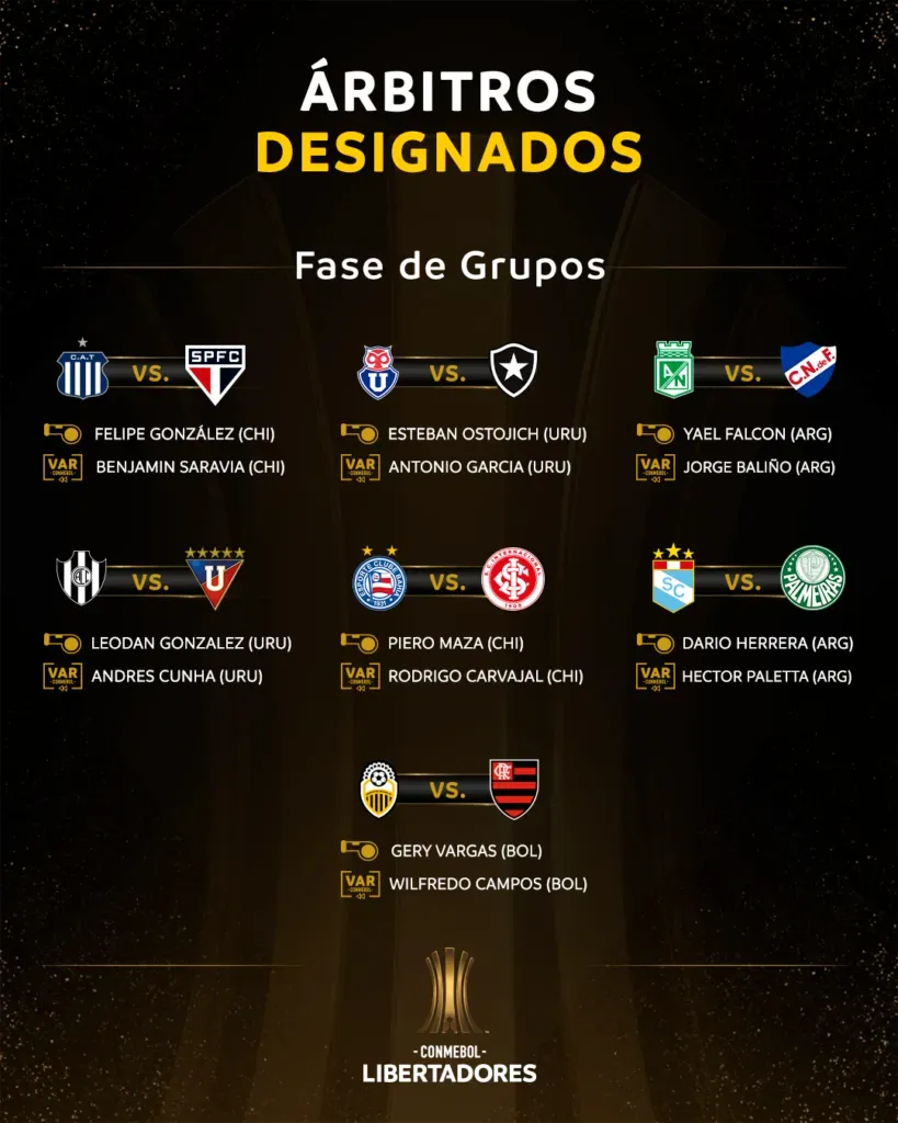 Además, habrá presencia referil chilena en la primera semana de Copa Libertadores. Felipe González dirigirá el lance entre Talleres de Córdoba y Sao Paulo por el Grupo D; mientras que Piero Maza hará lo propio en el lance entre Bahía e Inter de Porto Alegre del Grupo F.