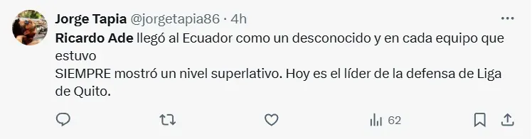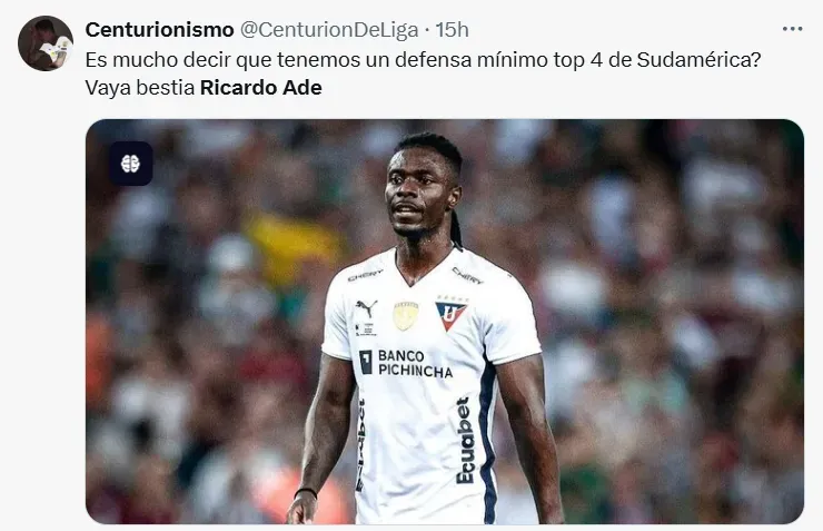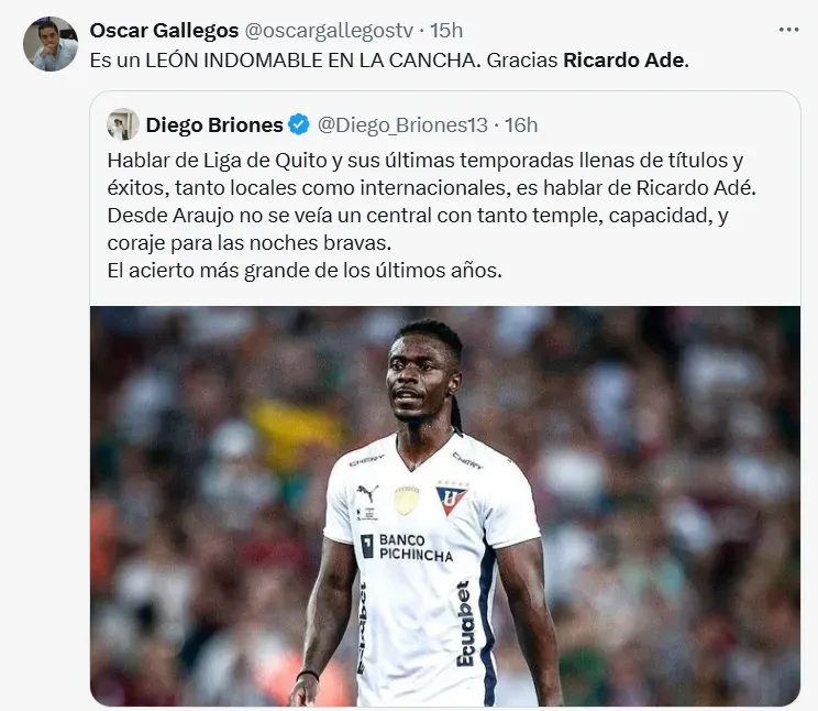 Otro comentó: “Es un león indomable en la cancha”, mientras que otra cuenta puntualiza que él, junto a otros jugadores, “me voy a la guerra”. Uno, le hizo un queque gigante al haitiano. “Hablar de Liga de Quito y sus últimas temporadas llenas de títulos y éxitos, tanto locales como internacionales, es hablar de Ricardo Adé. Desde Araujo no se veía un central con tanto temple, capacidad, y coraje para las noches bravas. El acierto más grande de los últimos años“, expresó.