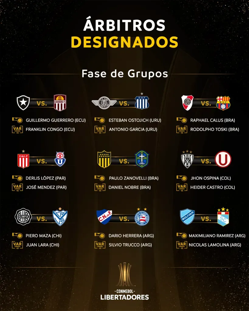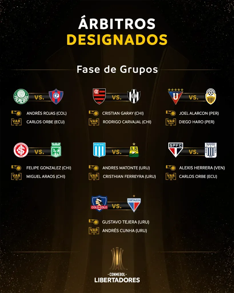 Además, habrá presencia referil chilena en la segunda semana de Copa Libertadores. Piero Maza dirigirá el lance entre Olimpia y Vélez Sarsfield por el Grupo H; Cristián Garay hará lo propio en Flamengo con Central Córdoba por el Grupo C; y Felipe González arbitrará a Internacional contra Atlético Nacional del Grupo F.