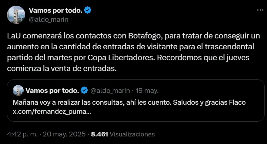 “La U comenzará los contactos con Botafogo, para tratar de conseguir un aumento en la cantidad de entradas de visitante para el trascendental partido del martes por Copa Libertadores. Recordemos que el jueves comienza la venta de entradas”, escribió en su cuenta de X (Ex Twitter) Aldo Marín.