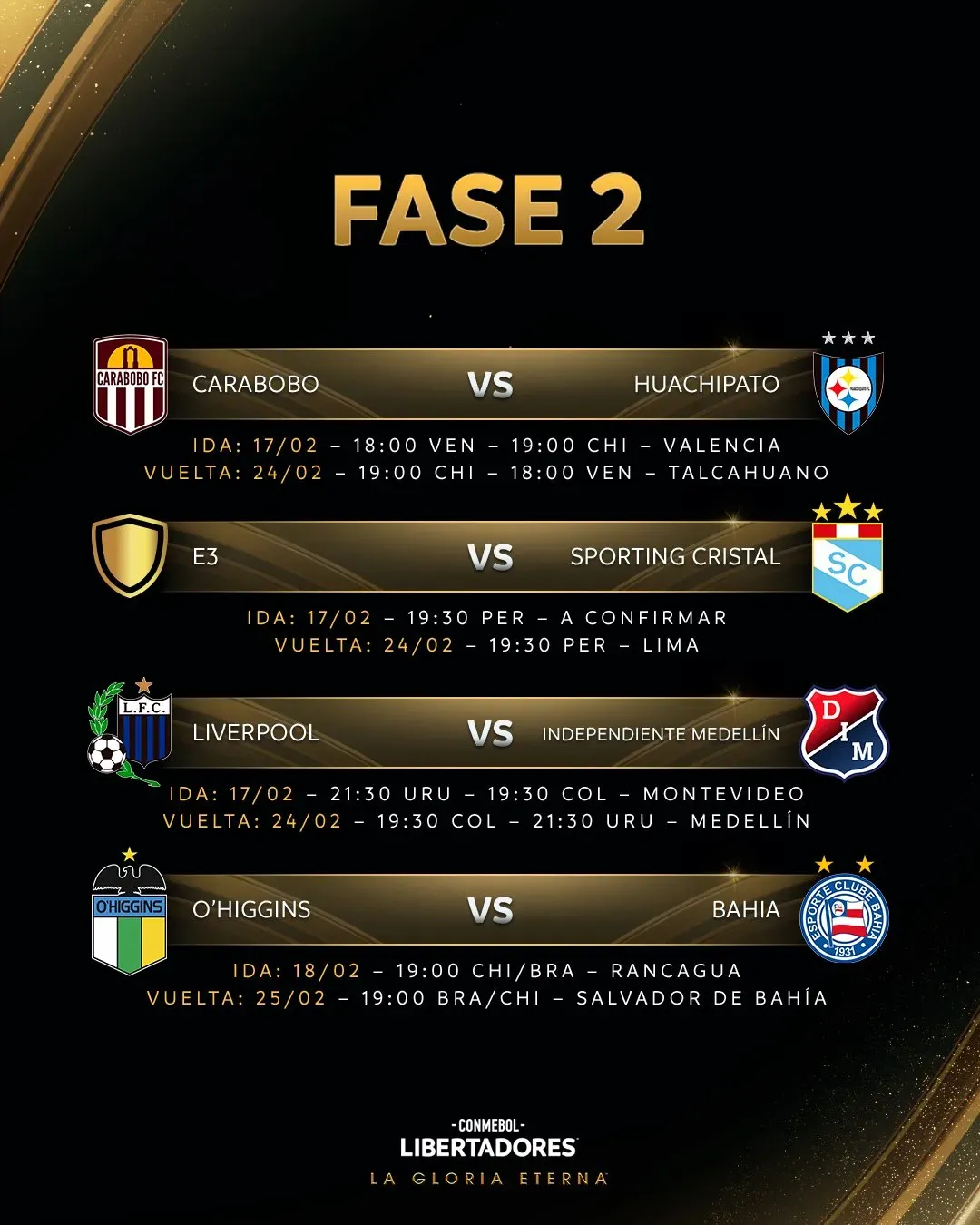 En tanto, el “Capo de Provincia”, recibirá al Bahía en el Estadio El Teniente de Rancagua el miércoles 18 de febrero a las 19:00 horas. Una semana después, el miércoles 25, en igual horario, se juega la revancha en el Arena Fonte Nova.
