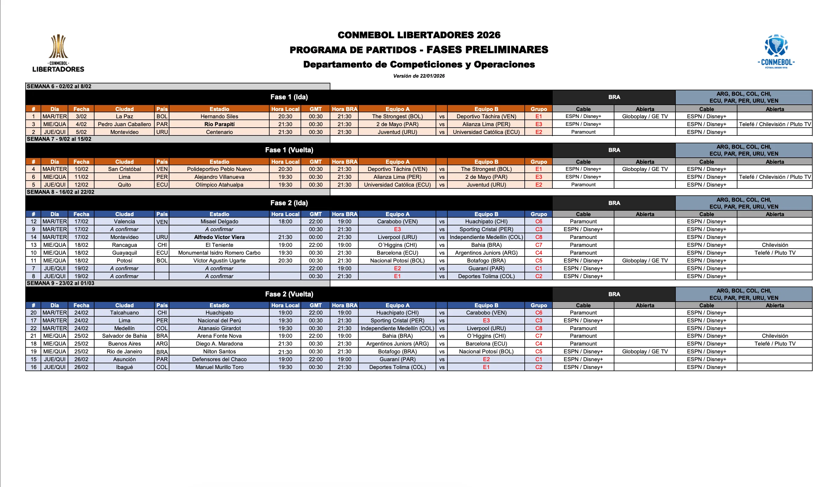 La Conmebol ratificó que Huachipato deberá jugar ante Carabobo por la segunda ronda de Copa Libertadores el martes 17 de febrero, desde las 19:00 horas, el Estadio Polideportivo Misael Delgado en Valencia, escenario donde jugó Universidad de Chile en 2025.