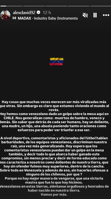 “A nivel deportivo, comentaristas y aficionados del fútbol hablan barbaridades de los equipos venezolanos, discriminan nuestra raíz, una vez más generalizando. Espero que los comentaristas venezolanos puedan dar un golpe en la mesa también, y decir todo lo que abarca haber ganado este compromiso”, añadió.