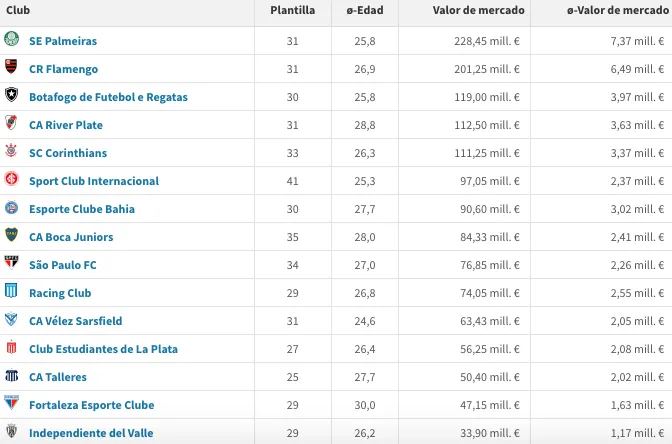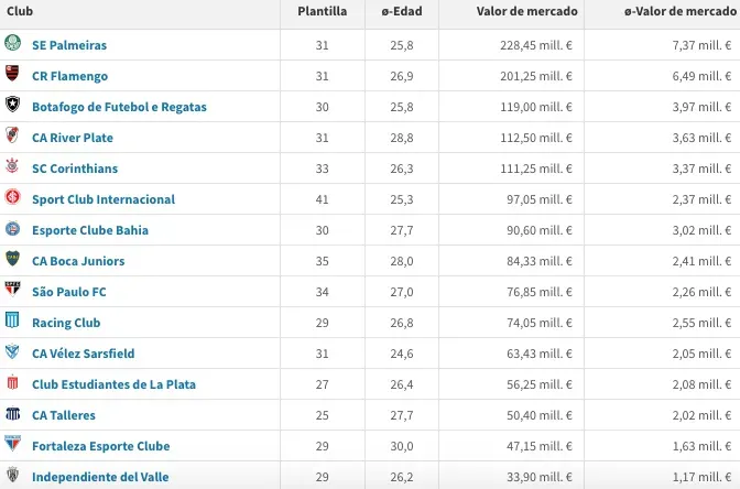 Del otro lado del espectro, el cuadro más barato de la Copa Libertadores es el Deportivo Táchira, cuya planilla está avaluada en 6,65 millones de euros.