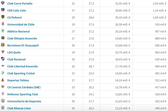 Son casi 200 millones de euros más que los equipos nacionales. Colo Colo tiene un valor total de 30,8 millones de euros, mientras que la plantilla de la Universidad de Chile cuesta 26,58 millones de la misma moneda.