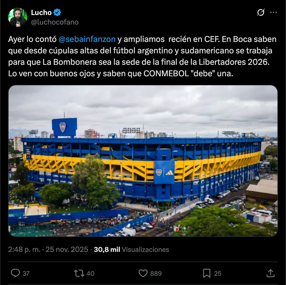 “En Boca Juniors saben que desde cúpulas altas del fútbol argentino y sudamericano se trabaja para que el recinto sea donde se juegue la definición de la Copa Libertadores 2026″, indica el también narrador, que a su vez agrega que “lo ven con buenos ojos y saben que Conmebol ‘les debe’ una“.