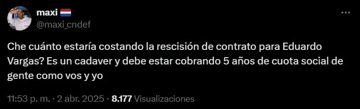 La peor crítica vino de un hincha que básicamente lo comparó con un muerto en descomposición: ¿cuánto estaría costando la rescisión de contrato para Eduardo Vargas? Es un cadáver y debe estar cobrando 5 años de cuota social de gente como vos y yo”, sostuvo ácido “Maxi” en X.