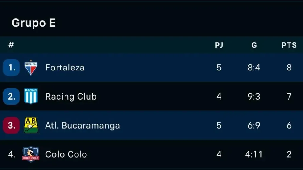 Así quedó la tabla de posiciones de Copa Libertadores en el Grupo E, donde Colo Colo está obligado a sumar en Argentina para seguir con opciones de clasificar, ya sea a segunda ronda o a Copa Sudamericana (al ser tercero del grupo).
