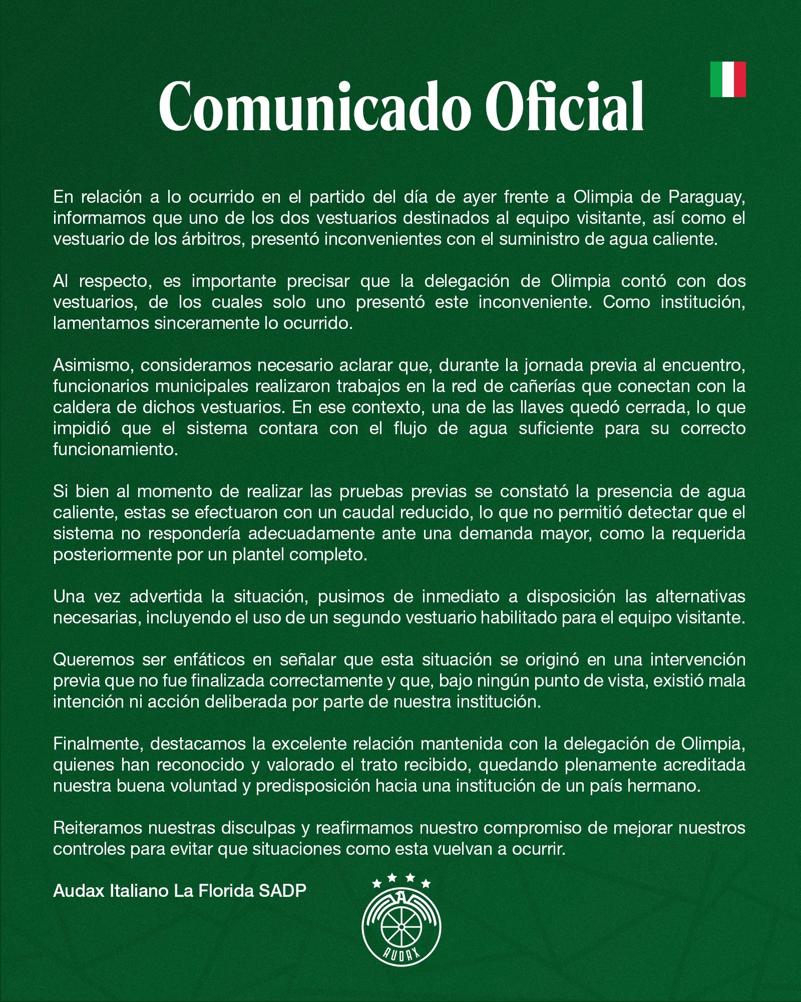 “Una vez advertida la situación, pusimos de inmediato a disposición las alternativas necesarias, incluyendo el uso de un segundo vestuario habilitado para el equipo visitante”, añade el club, quien enfatiza que “bajo ningún punto de vista, existió mala intención ni acción deliberada por parte de nuestra institución”.