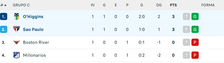Eso sí, comparte aquel puesto con su rival de esta tarde, Sao Paulo. Los brasileños vencieron por la mínima a Boston River, con gol de Damián Bobadilla. Además, los dos perdedores de la primera fecha, Millonarios y Boston River, se enfrentarán el miércoles 15 de abril (22.00 horas de Chile).