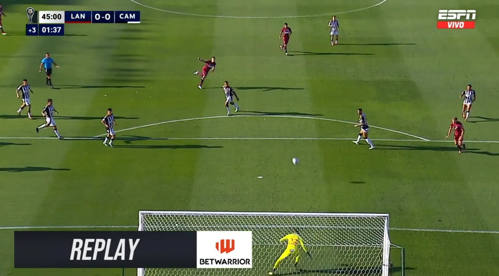 Pese a ello, la mejor acción de la primera mitad fue del equipo que llegó con mayor exactitud y peligro. Un tiro libre de Bernard desde el lado izquierdo terminó dando en el palo de Lozada, lo que significó la jugada más peligrosa de esa mitad.