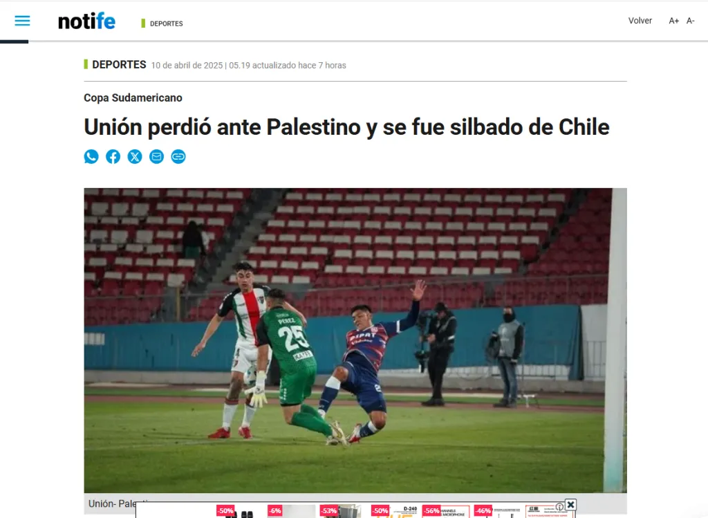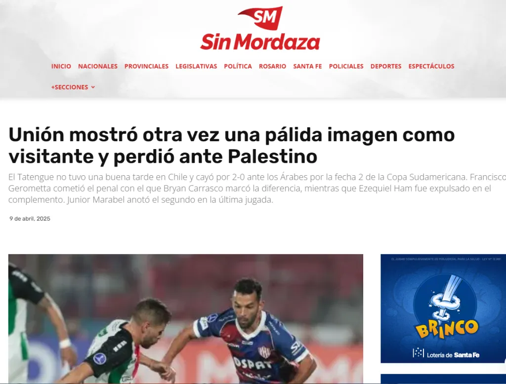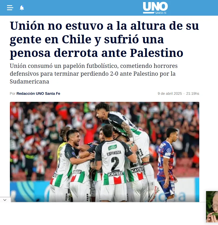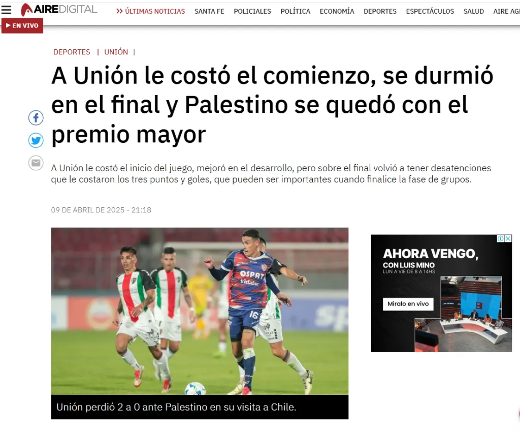 Aire de Santa Fe, por ejemplo, demostró ese sentimiento en su crónica del partido. “A Unión le costó el comienzo, se durmió en el final y Palestino se quedó con el premio mayor”, fue el titular que utilizaron.