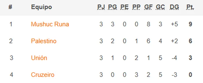 Con la victoria, Palestino es segundo en la tabla con 6 puntos. Lidera Mushuc Runa (9), mientras abajo están Unión (3) y Cruzeiro (0).