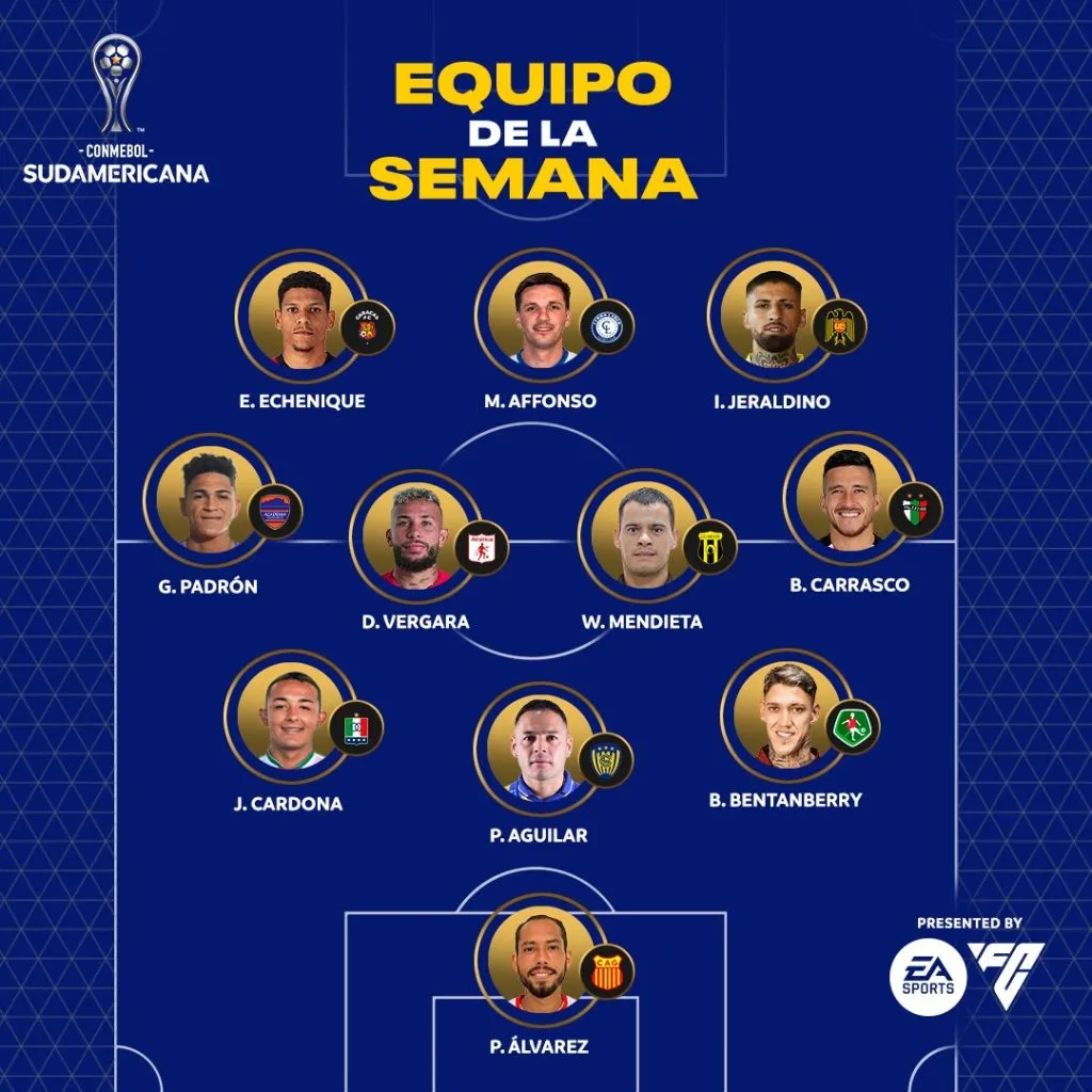 Junto a los chilenos aparecen en el 11 ideal el arquero Patricio Álvarez (Atlético Grau); los defensas Bryan Bentaberry (Mushuc Runa), Pablo Aguilar (Sportivo Luqueño) y Jorge Cardona (Once Caldas); los volantes William Mendieta (Guaraní), Duvan Vergara (América de Cali) y Gerardo Padrón (Puerto Cabello); más los delanteros Mauricio Affonso (Cerro Largo) y Ender Echenique (Caracas).