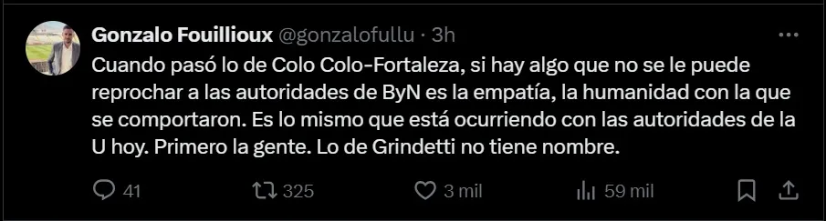 “Cuando pasó lo de Colo Colo-Fortaleza, si hay algo que no se le puede reprochar a las autoridades de ByN es la empatía, la humanidad con la que se comportaron. Es lo mismo que está ocurriendo con las autoridades de la U hoy. Primero la gente. Lo de Grindetti no tiene nombre”, escribió en X (ex Twitter).