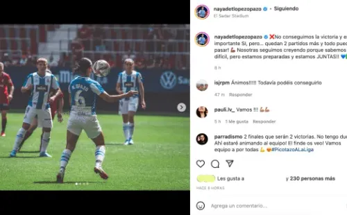 Por otro lado, el Espanyol de Nayadet López Opazo cayó por 2-0 a manos del Osasuna, quien sumó 56 puntos y se hizo de la cima de la tabla de posiciones del grupo norte. La chilena jugó los 90 minutos y recibió su décima tarjeta amarilla en lo que va de temporada 2021/22 del Reto Iberdrola.