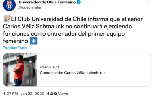 Mediante un comunicado, la U anunció que su DT durante los últimos tres años “no continuará ejerciendo funciones como entrenador del primer equipo femenino”. Véliz asumió el cargo a principios del 2020, seis meses después de dejar Colo Colo a mediados de 2019, y fue quien encabezó el proceso de profesionalización azul.