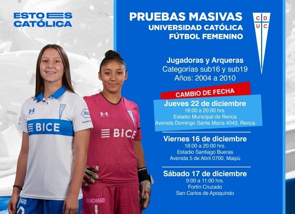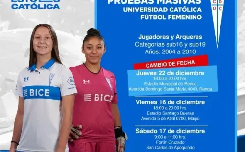 Universidad Católica busca jugadoras del 2004 al 2010 (12a 18 años) para sus Sub 19 y Sub 16 en tres lugares distintos de la Región Metropolitana: estadio Santiago Bueras (viernes 16), Fortín Cruzado en San Carlos de Apoquindo (sábado 17) y estadio Municipal de Renca (jueves 22).