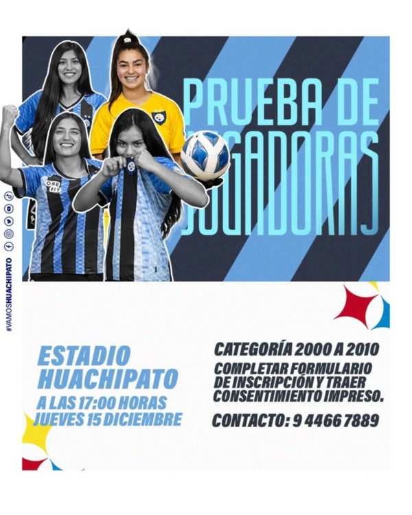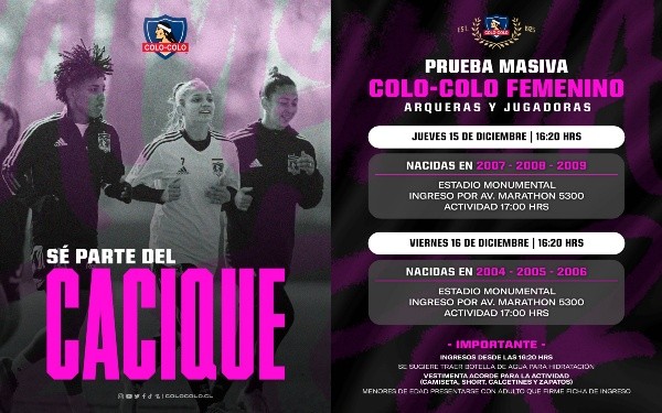 Pero no son el único club. Huachipato, por ejemplo, convocó a nacidas entre 2000 y 2010 (12 a 22 años) para estejueves 15 de diciembre a las 17:00 horas en el estadio homónimo en Talcahuano.