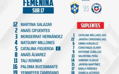 El once inicial la selección chilena Sub-17 frente a Brasil seráconMartina Salazar; Anaís Cifuentes, Martina Oses, Monserrat Hernández, Catalina Figueroa;Anaís Álvarez, Paloma Bustamante, Tali Rovner;Maitte Tapia, Yenniffer Zambrano yNatsumy Millones.