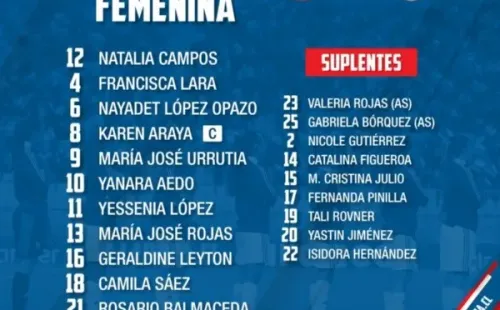 Natalia Campos; Rosario Balmaceda, Nayadet López Opazo, Camila Sáez, Geraldine Leyton; Karen Araya, Yessenia López, Francisca Lara; María José Rojas, María José Urrutia y Yanara Aedoserán las once chilenas que busquen la victoria.