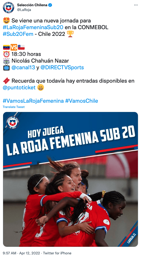 El torneo Sudamericano Femenino Sub 20 sigue desarrollándose y este martes 12 de abril comienza a disputarse la fecha 4 de la fase de grupos. La Selección Chilena será quien juegue el partido en horario prime del día, y su rival será Venezuela. El partido será en el estadio Nicolás Chahuán Nazar desde las 18:30 horas.