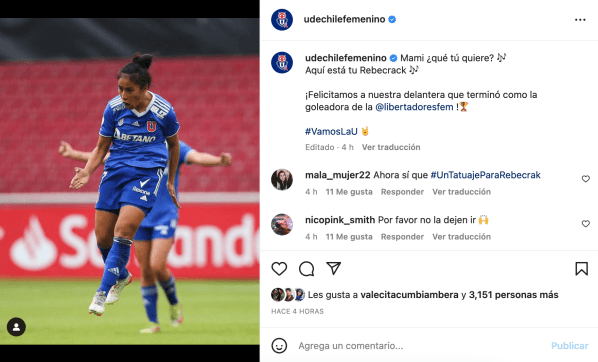 Universidad de Chile Femenino celebró en redes sociales el logro de Rebeca Fernández muy ad hoc a la realidad país actual: con una canción de Bad Bunny. “Mami ¿qué tú quiere?Aquí está tu Rebecrack ♫¡Felicitamos a nuestra delantera que terminó como la goleadora de la@libertadoresfem!”.
