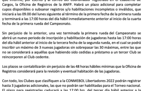 En las bases del torneodetallan cuál es el plazo fatal que tienen los clubes para inscribir jugadoras de cara al siguiente certamen. ¿Hasta cuándo pueden? El proceso “iniciará a las 09.00 del lunes siguiente al término de la primera fecha de la primera rueda y terminará a las 17:00 horas del día hábil inmediatamente anterior al inicio de la cuarta fecha de la primera rueda del Campeonato”.