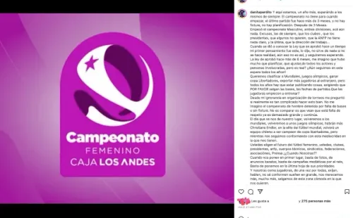 “Desde mi ignorancia en organización de torneos me preguntosi realmente es tan complicado hacer esto bien. No me imagino el campeonato de hombres detenido por falta de bases o sin fixture. No es comparar, es que vean que estafalta de respeto ya es demasiado grande y continúa”, manifestó Daniela Pardo.