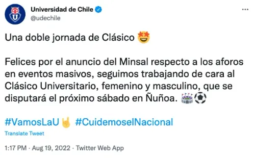“Una doble jornada de Clásico. Felices por el anuncio del Minsal respecto a los aforos en eventos masivos, seguimos trabajando de cara al Clásico Universitario, femenino y masculino, que se disputará el próximo sábado en Ñuñoa“, informó el cuadro laico en su cuenta de Twitter.