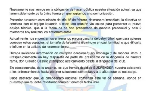 Además, el comunicado detalla que “actualmente nos encontramos entrenando en una cancha de baby fútbol, que para quienes conocen estos espacios, el tamaño de la cancha disminuye en casi la mitad lo que dificulta e influye en la calidad del entrenamiento”.