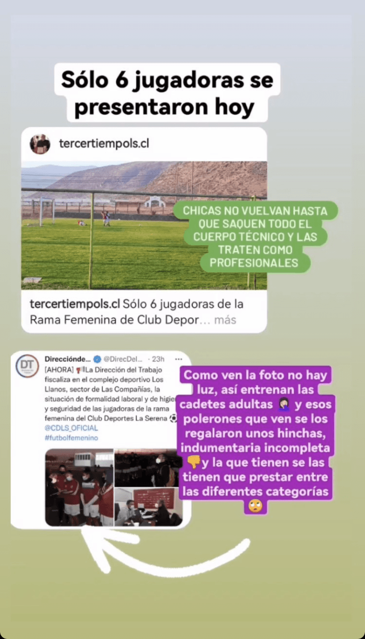 Paola Hinojosa escribió en su cuenta de Instagram,”chicas, no vuelvan hasta que saquen a todo el cuerpo técnico y las traten como profesionales. Como ven en la foto, no hay luz. Así entrenan las cadetes y adultas y esos polerones que ven los regalaron unos hinchas. Indumentaria incompleta. Las que tienen se las deben prestar entre las diferentes categorías”.