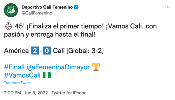 A los 41’, una mano en el área de Fabiana Yantén pudo significar un penal a favor del Deportivo Cali, que podría haber implicado igualar el marcador global y forzar penales. Sin embargo, la árbitra decidió no pitar y todo quedó con el mismo dos a cero parcial de cara al descanso.