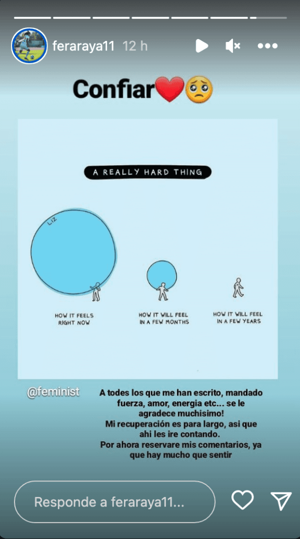 Araya compartió en sus Instagram Stories una imagen donde confirma su lesión.”A todes los que me han escrito, mandado fuerza, amor, energía, etc., se les agradece muchísimo! Mi recuperación es para largo, así que ahí les iré contando. Por ahora reservaré mis comentarios, ya que hay mucho que sentir”, expresó. ¡Fuerza, Fernanda!