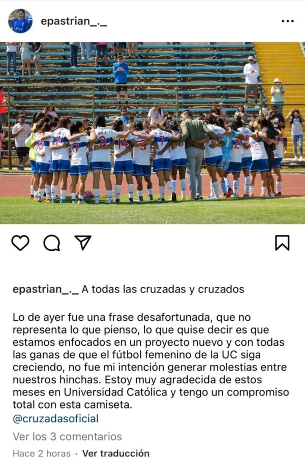 “No fue mi intención generar molestias entre nuestros hinchas. Estoy muy agradecida de estos meses en Universidad Católica y tengo un compromiso total con esta camiseta”, concluyó Pastrián.